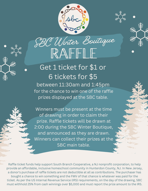 There will be additional raffle tickets available for purchase at the South Branch Cooperative main table. Get 1 ticket for $1 or 6 tickets for $5 between 11:30am and 1:45pm at the event, for the chance to win one of the raffle prizes displayed at the SBC table. These prizes will be selections from each of the vendors at the boutique. Winners must be present at the time of drawing in order to claim their prize. Raffle tickets will be drawn at 2:00 during the SBC Winter Boutique, and announced as they are drawn. Winners can collect their prizes at the SBC main table.